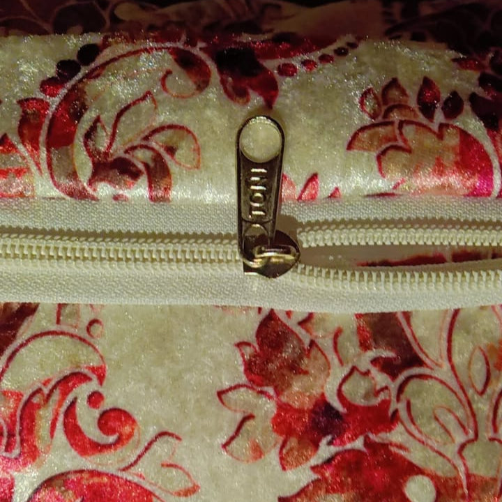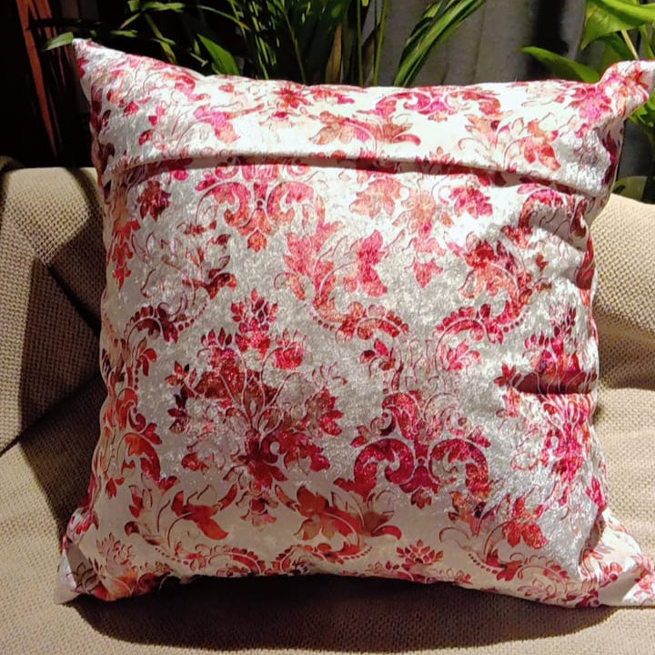 Rosy oasis Printed Suede Premium Fabric Cushion Cover Floral pattern with shades of pink and red on a white background